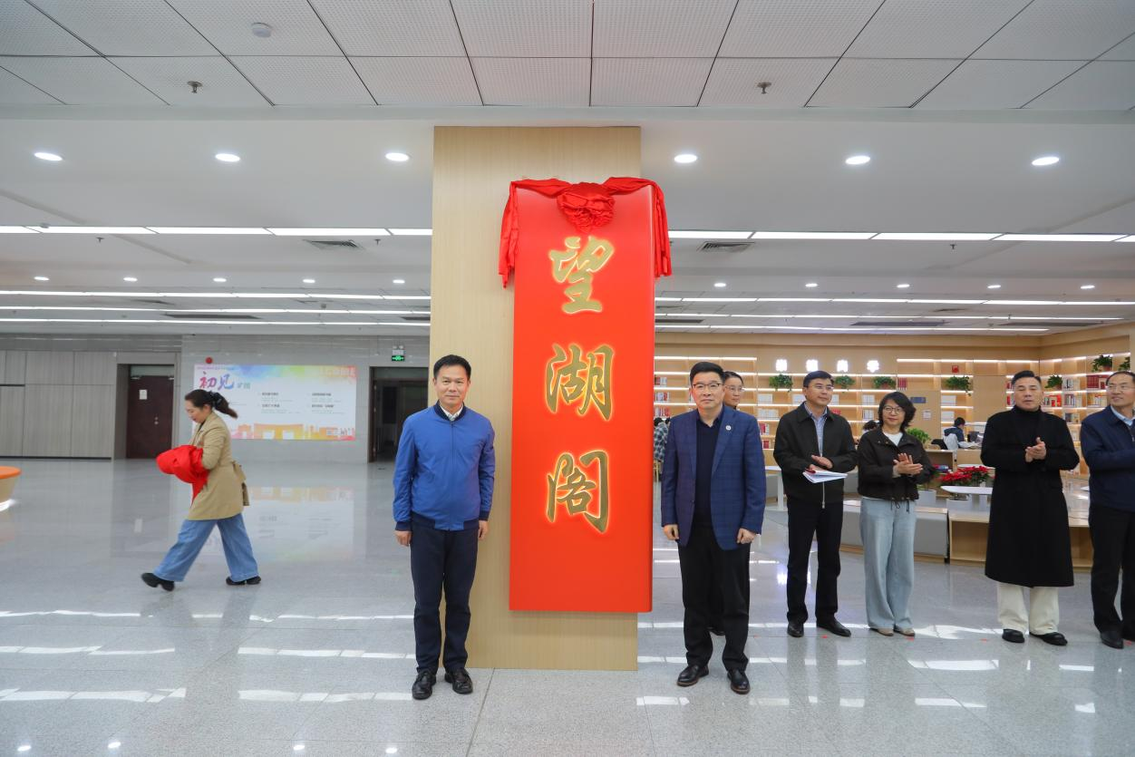 对外合作与发展处处长钟晓东、图书馆馆长王新宇共同为“望湖阁”主题阅览区揭牌