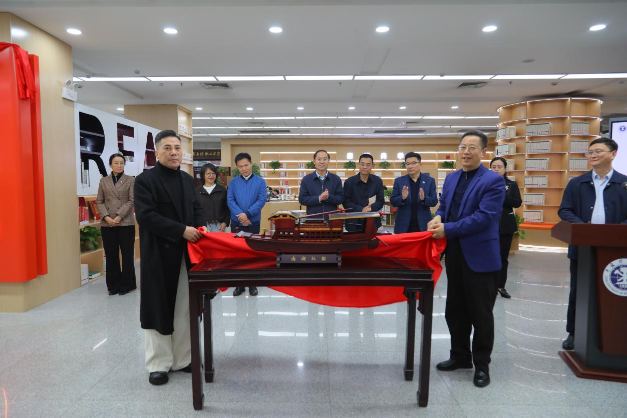 对外合作与发展处处长钟晓东、图书馆馆长王新宇共同为“望湖阁”主题阅览区揭牌。直属业务单位党总支书记方跃平、徐厚俊先生共同为红船模型揭幕。