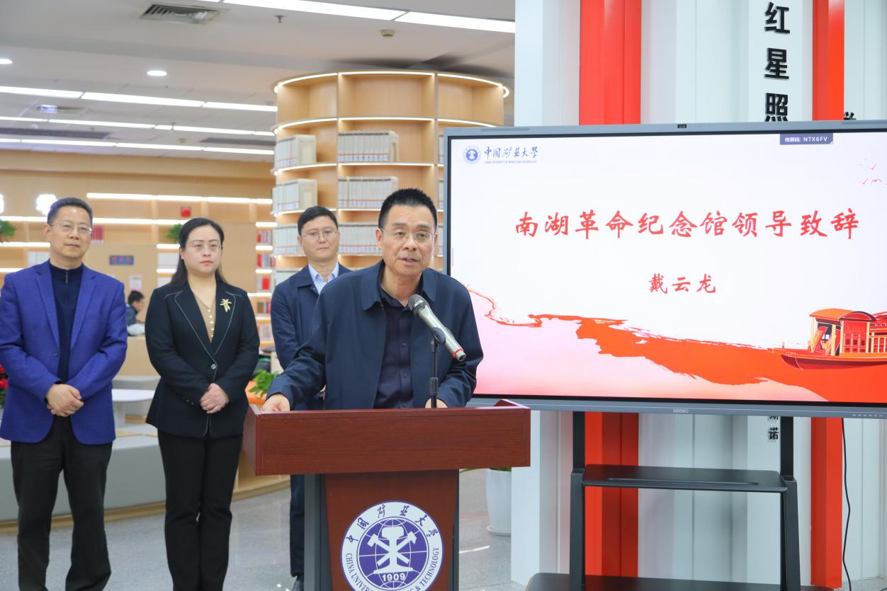 戴云龙代表南湖革命纪念馆致辞,对“望湖阁”主题阅览区的建成启用表示热烈的祝贺,对中国矿业大学长期以来深耕红色教育、厚植书香底蕴、坚守铸魂育人的使命担当致以崇高的敬意,向长期以来关心和支持馆校合作的领导、广大师生致以诚挚的感谢,并表示未来将从共建红色文献资源库、共育红色文化育人特色品牌和共创校地合作示范标杆等三方面与矿大图书馆持续深化合作。