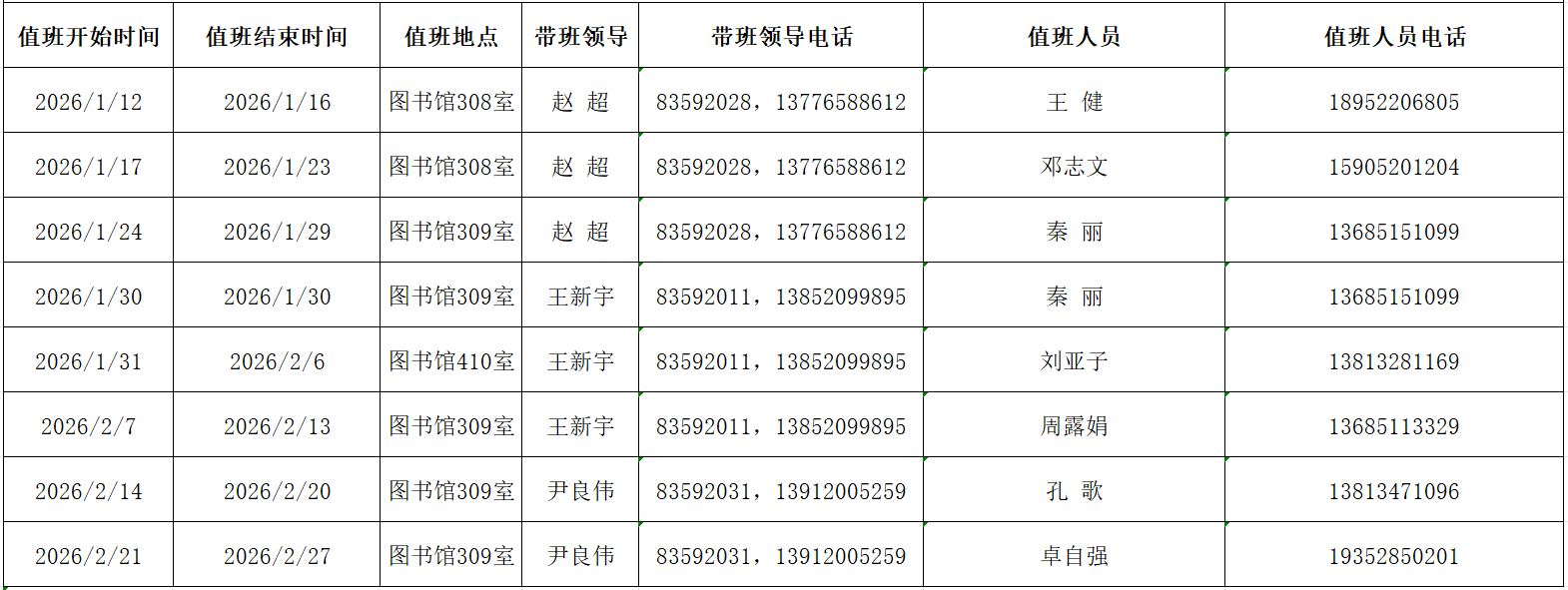 2026年图书馆领导及办公室寒假值班安排